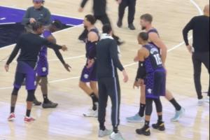 暂停期间,威少、施罗德以及施罗德谈笑讨论超远三分的位置