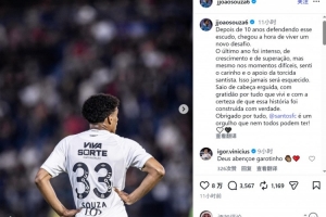 24直播网01月18日讯 桑托斯19岁左后卫索萨即将加盟热刺。他已在社媒发文告别,称在效力俱乐部10年后,是时候迎接新挑战,并感谢球迷的支持与关爱,称其为用真诚书写的骄傲。据罗马诺报道,转会费为1500万欧元。
