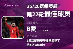 本轮联赛曼联2-0击败曼城,展现了酣畅淋漓的红魔反击艺术。B费送出助攻的同时评分也是全场最高分,最终他得到超6万张投票,当选【体育资讯X咪咕体育英超第22轮最佳球员】。