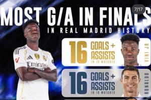 24直播网01月23日讯 维尼修斯更新社媒,晒出自己在皇马队史决赛的进球+助攻数据。他15场贡献16个,与C罗、本泽马、普斯卡什并列队史榜首,展现了他在关键比赛中的决定性作用。
