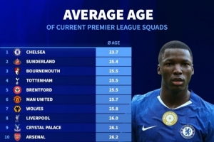 德转数据显示英超球队平均年龄:切尔西以23.7岁居首年轻,富勒姆则以28.9岁为最年长。