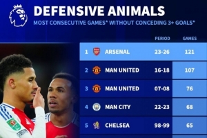 英超球队“单场不丢3球”连续场次排名:阿森纳121场领跑,曼联紧随其后。