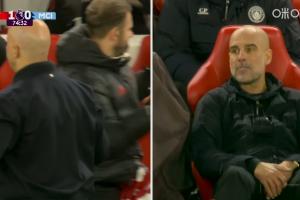 体育资讯02月09日讯 利物浦vs曼城,索博第74分钟世界波,瓜帅坐在场边人直接往后一瘫,斯洛特则兴奋庆祝。