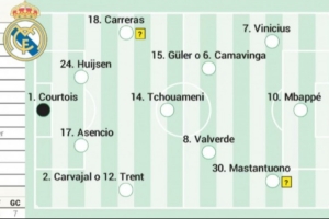 24直播网02月14日讯 西甲第24轮皇马将战皇家社会。阿斯报预测首发:库尔图瓦镇守龙门;后防卡瓦哈尔或阿诺德搭档劳尔·阿森西奥与赫伊森;中场居莱尔或卡马文加竞争;前场由马斯坦托诺、姆巴佩和回归的维尼修斯组成。