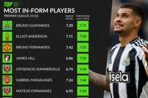 whoscored英超近期状态榜:吉马良斯、B费领衔,加布、帕尔默在列