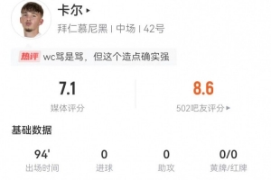 体育资讯2月15日讯 拜仁在本轮德甲3-0完胜不莱梅,卡尔本场数据如下: