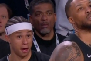 比赛中利拉德出战时,马刺新秀卡特·布莱恩特被利指导神准的投射发挥惊出了表情包,画面非常有喜感。