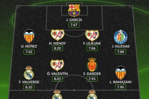 24直播网02月17日讯 西甲第24轮最佳阵容出炉,皇马球员巴尔韦德、维尼修斯和贡萨洛·加西亚入选。门将由巴萨的霍安·加西亚担任,后防线上巴列卡诺的努涅斯和门迪表现亮眼。此外,瓦伦西亚的拉马扎尼与马略卡的达德尔也入选中场。