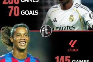 维尼修斯在西甲中已经打进70球,追平了同胞罗纳尔迪尼奥的进球数量。但是,巴萨传奇要比他少用85场比赛。