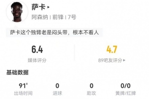 24直播网02月23日讯 阿森纳球星萨卡在对阵热刺的英超比赛中表现活跃。他首发出战91分钟,5次射门2次射正,并有4次成功过人,但错失2次良机。此外,他送出2次关键传球,并在防守端贡献1次拦截和2次抢断,最终获评6.4分。