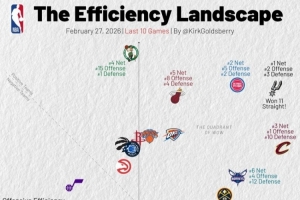 横轴代表进攻效率,越靠右越好,纵轴代表防守效率,越靠上越强。第一象限的球队多为发挥出色的球队,而在第三象限的球队通常为战绩比较糟糕的球队。
