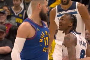 GIF-瓦兰掩护犯规后又支肘打到海兰德脸部,双方险些发生小冲突,裁判回看升级瓦兰一级恶意
