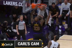 下一篇: 斯玛特快攻假动作晃倒詹姆斯?无碍!詹姆斯迅速起身,强势完成2+1暴扣。