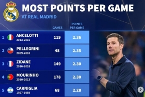 体育资讯1月13日讯 皇马已经官宣解雇哈维·阿隆索,《转会市场》统计显示后者位列皇马队史拿分榜第7位。