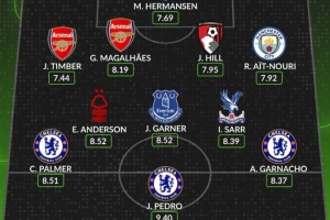 24直播网03月06日讯 Whoscored评选出本轮英超最佳阵容。切尔西表现强势,帕尔默、佩德罗、加纳乔包揽前场三席。阿森纳的廷伯与加布里埃尔入选后卫,门将为赫尔曼森,中场则由安德森、加纳和萨尔组成。