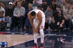 GIF-唐斯强突大洛左手上篮不中,随后一直捂着膝盖,有点不适