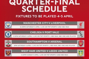 24直播网03月13日讯 足总杯1/4决赛开球时间公布。焦点战曼城对阵利物浦将于4月4日19:45进行。其他三场比赛分别为:切尔西对阵维尔港(4月5日0:15)、南安普顿对阵阿森纳(4月5日3:00)以及西汉姆对阵利兹联(4月5日23:30)。