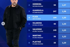 24直播网03月17日讯 德国转会市场统计了巴萨主帅场均拿分榜(至少执教15场)。弗里克以2.35分位列第四,仅次于恩里克(2.41)、埃雷拉(2.37)和瓜迪奥拉(2.36)。该榜单展现了巴萨历史上执教表现最出色的十位主帅。