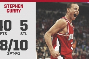 本场比赛,当时效力于戴维森学院的库里出战39分钟,22投14中,三分球10中8、罚球6中4,砍下40分3篮板2助攻5抢断,其中下半场则是贡献30分。