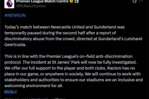 “此举符合英超联赛的场上反歧视协议。圣詹姆斯公园球场发生的这起事件现在将接受全面调查。我们向该球员及两家俱乐部提供全力支持。种族主义在我们的比赛中、或社会任何角落都绝无立足之地。我们将继续与各利益相关方及当局合作,确保我们的球场成为一个对所有人极具包容性且受欢迎的环境。”
