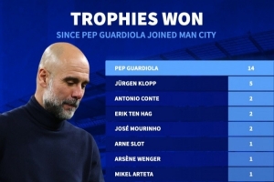 自瓜迪奥拉加入曼城以来,英超俱乐部赢得奖杯数据排名: