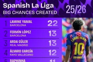 24直播网03月26日讯 根据Squawka统计,本赛季西甲创造机会次数排名出炉。巴萨新星亚马尔以22次创造机会次数高居榜首。紧随其后的是队友费尔明和皇马的居莱尔,两人均创造13次机会。巴萨球员在榜单中占据显著优势,展现了强大的进攻创造力。