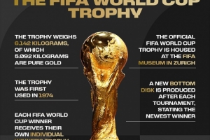 24直播网03月28日讯 国际足联官方科普大力神杯,为世界杯预热。该奖杯重6.142公斤,含金5.092公斤,自1974年起启用。原版珍藏于苏黎世国际足联博物馆,每届赛后都会为冠军得主制作新的底座圆盘,而每支冠军球队都会获得一座专属的复制奖杯。