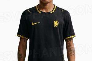 切尔西新赛季客场球衣谍照曝光:黑色主调尽显简约,衣领与袖口以金色细节点缀。