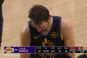 比赛第三节2分27秒,湖人当家球星卢卡·东契奇突破造成犯规后两罚命中砍下本场第33分!