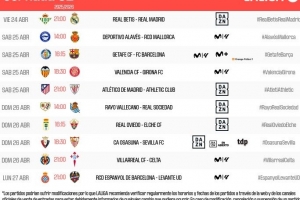 24直播网04月04日讯 西甲官方公布第32轮赛程,焦点战包括4月25日3点贝蒂斯vs皇马、22点15分赫塔费vs巴萨,以及马竞对阵毕尔巴鄂等比赛。本轮比赛将从4月25日持续至28日,多场对决安排在凌晨及深夜。