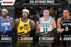 24直播网04月07日讯 NBA常规赛数据:自2018-19赛季起,仅有四位替补球员单赛季得分超1000分且球队胜率超70%,分别为哈雷尔、克拉克森、普理查德及凯尔登·约翰逊。除凯尔登外,其余三人均荣膺当赛季最佳第六人。