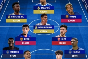 24直播网04月07日讯 《转会市场》公布欧冠八强最贵阵,总身价13.3亿欧元。前锋线由皇马的维尼修斯、姆巴佩及巴萨的亚马尔领衔;中场有佩德里、贝林厄姆和赖斯;后卫和门将则分别来自巴黎、巴萨和阿森纳的球员组成。