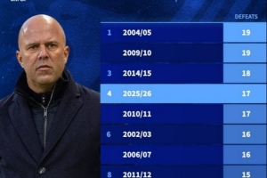 24直播网04月09日讯 利物浦欧冠首回合0-2负于巴黎,本赛季各项赛事失利已达17场。这一数据追平了球队10/11赛季的纪录,并列为本世纪单赛季第4差战绩。此前单赛季最高失利纪录为19场,出现在04/05和09/10赛季。