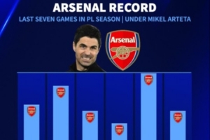 体育资讯4月11日讯 阿森纳在本轮英超爆冷主场1-2不敌伯恩茅斯,数据统计显示塔帅执教阿森纳的赛季最后7轮联赛从未拿满分数。