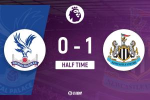 上半场伤停补时2分钟,半场结束,水晶宫暂0-1纽卡斯尔联。