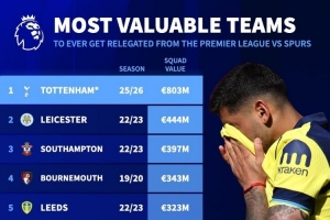 若热刺不幸降级,其8.03亿欧元的球队总身价将创下英超降级球队的历史新高。