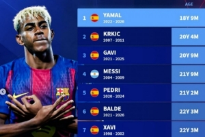 24直播网04月15日讯 巴萨新星亚马尔18岁9个月达成生涯150次出场,创下队史最年轻纪录。他力压梅西、哈维等传奇,在该榜单上排名第一。博扬、加维等名紧随其后,展现了巴萨青训的强大实力。