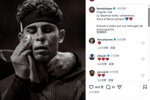 此役巴萨中场费尔明被马竞门将穆索踢到脸部,费尔明社媒晒出脸部受伤的照片,并写道:“巴萨人的荣耀!我们已倾尽全力,我们会再回来的。巴萨万岁,永远!感谢大家的关心留言。”