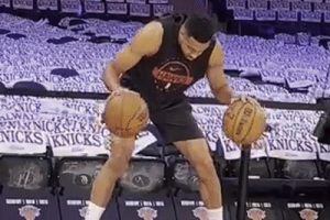 体育资讯4月23日讯 近日,老鹰球员CJ·麦科勒姆赛前在场边练习控运。
